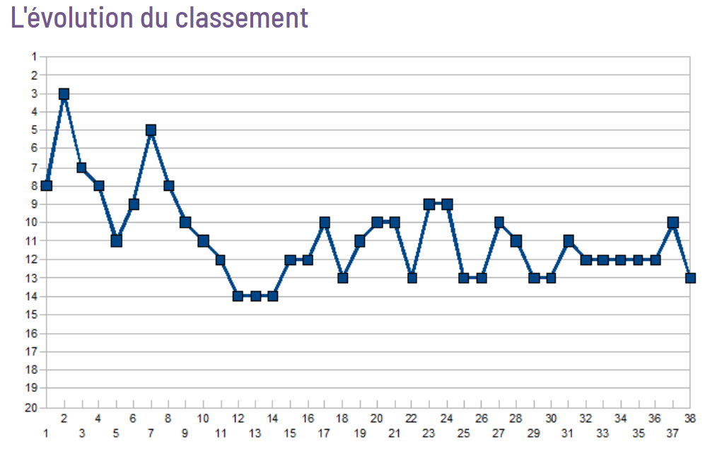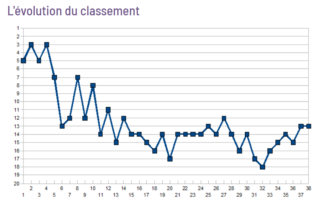 Evidemment la saison s’avère difficile, néanmoins les Toulousains n’approchent à aucun moment le zone de relégation en terminant à une satisfaisante 13e place, remarquable au bout d’une saison avec des automatismes à retrouver, à seulement trois point de Montpellier 9e du classement. Un autre motif d’espoir étant la surabondance de matchs nuls (quinze au total), cela représente une perte de point significative mais aussi une forte capacité mentale pour revenir au score en fonction des matchs. Pas de quoi s’alarmer me direz-vous pour Santini. Il sera recruté à la fin de la saison et partira en direction de Lille pour entrainer le LOSC (8e la saison précédente) pour replacer l’entraineur emblémaique Georges Heylens.